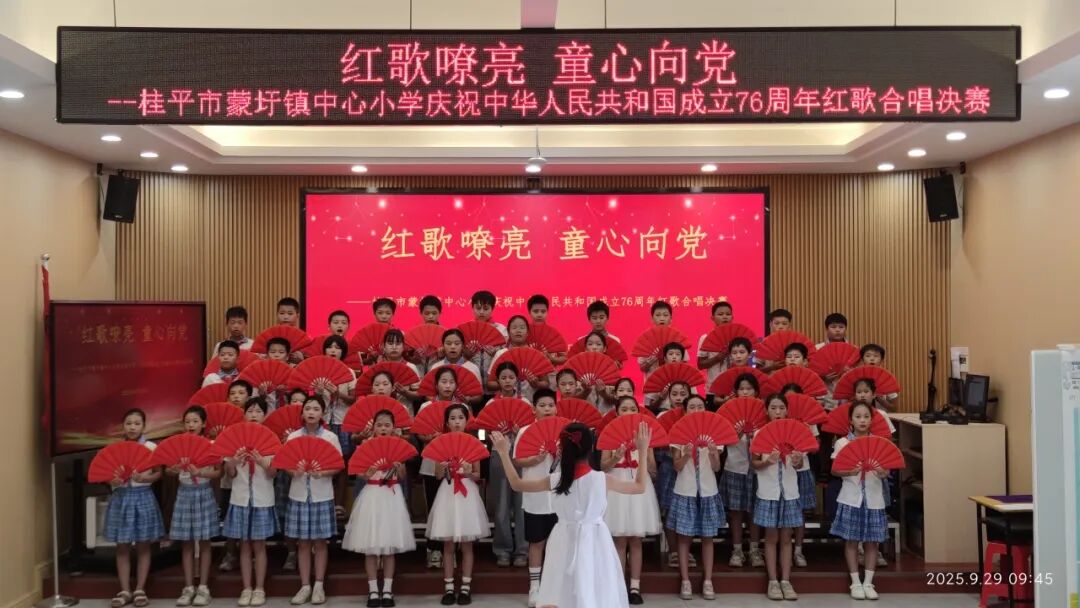 ▲9月29日,桂平市蒙圩镇中心小学举行“红歌嘹亮 童心向党”庆祝新中国成立76周年红歌合唱决赛。全体学生以激昂的歌声深情演绎经典曲目,展现新时代少年童心向党、昂扬向上的精神风貌。