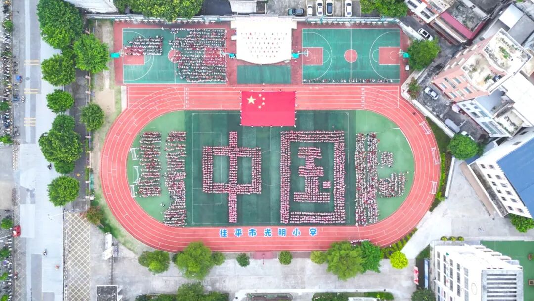 ▲9月29日,桂平市光明小学开展“欢度华诞·情满月圆”双节主题活动。同学们集结在绿茵场上拼组成巨大的“中国”字样,凝聚学子们对祖国的深情。