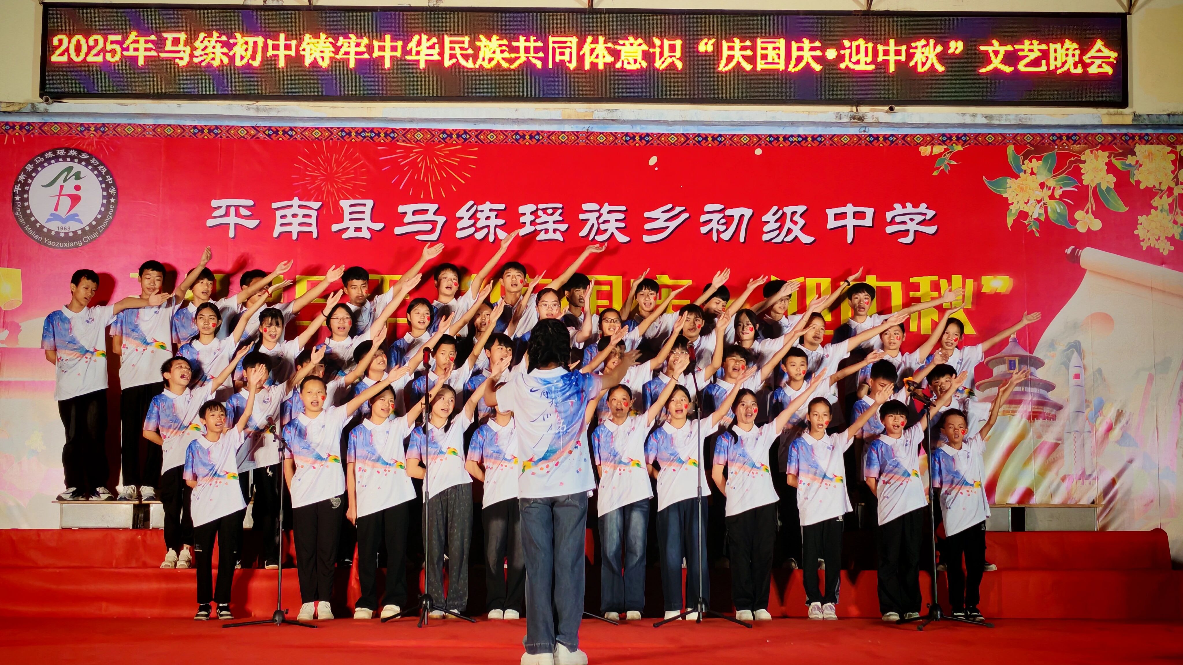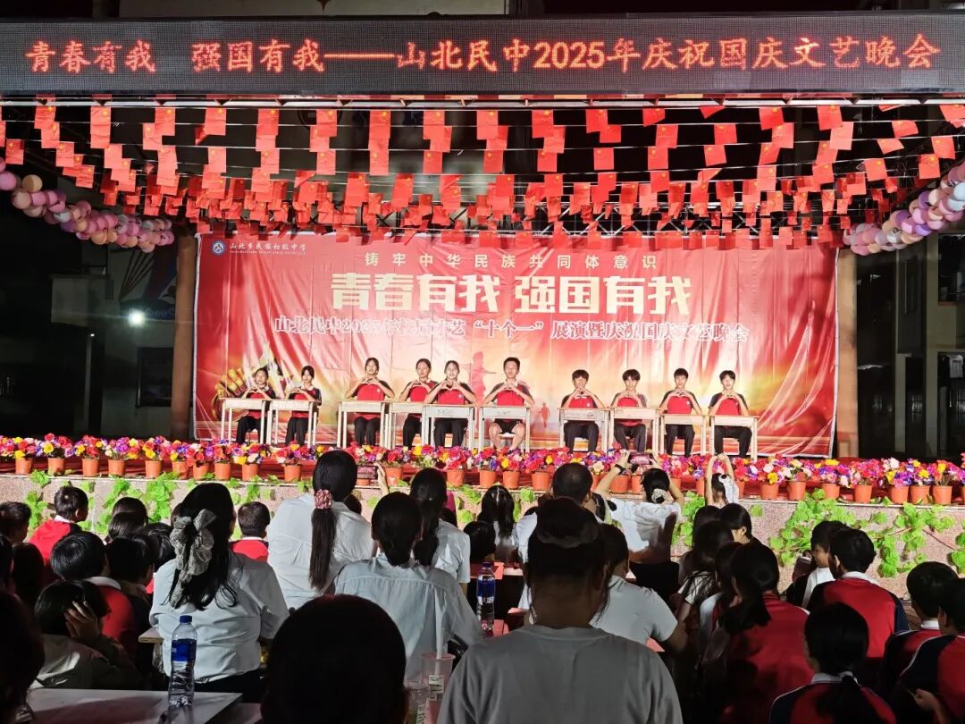 ▲9月29日,覃塘区山北乡民族初级中学举行以“青春有我 强国有我”为主题的2025年校园才艺“十个一”展演暨庆祝国庆文艺晚会。1200余名师生齐聚现场,共赴艺术盛宴。