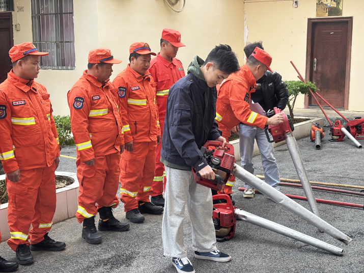 培训现场,平南县应急局工作人员通过理论讲解与实操演示相结合的方式,详细介绍森林防灭火的重要性、灭火器材的操作规范等内容。在实操环节,工作人员从防灭火设备的启动、调试到实际运用,边讲解边演示,手把手指导队员们操作风力灭火机等专业设备。队员们认真学习,积极上手操作,确保熟练掌握,现场学习氛围浓厚。