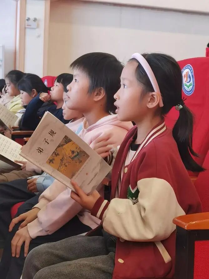 学习环节中,同学们手持《弟子规》跟随老师齐声诵读:“弟子规,圣人训,守孝悌,次谨信……”琅琅书声响彻校园,句句传递着崇德、向善、孝敬的传统美德与智慧,让“孝”的种子悄悄在心中扎根。
